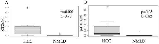 Boxplots comparing (A) CTCs and (B) p-CTCs between patients with HCC and those with NMLD. The lines within each box represent the median values, the boxes’ limits indicate the first and third quartiles, and the whiskers represent the smallest and largest values within 1.5 times of the IQRs from the first and third quartiles. p-values and ξ-effect sizes were determined using one-way ANOVA, and p < 0.05 was considered significant.