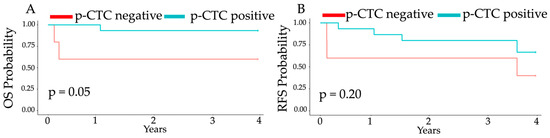 As depicted in Figure 4, there was a significant difference in the overall survival probability across HCC patients with or without p-CTCs (p = 0.05), although there was no statistically significant difference in the recurrence-free survival probability across HCC patients with or without p-CTCs (p = 0.20) within the follow-up period.