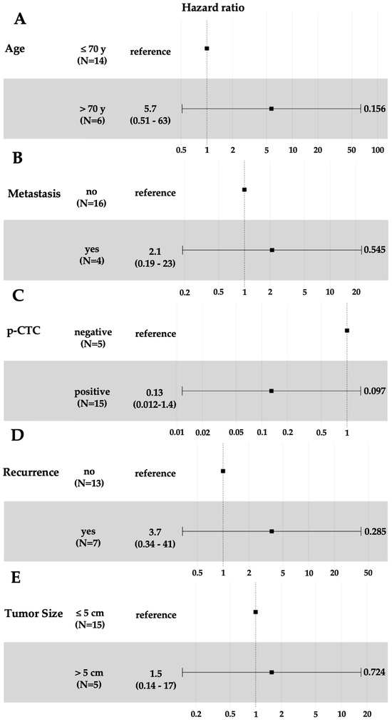 In the univariate Cox regression analysis of overall survival shown in Figure 5, we did not observe any significant difference in the risk of death for HCC patients with respect to those older than 70 years (HR = 5.7; 95% CI 0.51–63, p = 0.16), metastasis (HR = 2.1; 95% CI 0.19–23, p = 0.54), recurrence (HR = 3.7; 95% CI 0.34–41, p = 0.28) or tumor size >5 cm (HR = 1.5; 95% CI 0.14–17, p = 0.72). However, again, there was no significant difference in the risk of death for HCC patients with p-CTCs compared with those without p-CTCs (HR = 0.13; 95% CI 0.012–1.4, p = 0.1). Owing to the small sample size and the lack of statistical significance in the univariate analysis, no significant results could be delivered through the multivariate analysis.