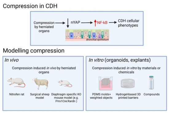 CDH affects multiple cell types at different developmental stages. Organoids offer a promising platform to recapitulate disease phenotypes, though their application in CDH research is in its infancy. The recognition of the need to manipulate mechanical compression during differentiation, as would occur in in vivo CDH lung development, has resulted in attempts to create mouse lung CDH organoid models [73]. Either mediated by forskolin or cyclic strain, mouse CD326+ve cells and lung fibroblasts were subjected to compression during organoid culture. Disrupting biomechanics altered the development and differentiation of the organoids, and while not fully recapitulating CDH phenotypes, an increase in basal and AT1/AT2 progenitor cells was observed, as seen in other CDH models [4,5,73]. Changes in gene expression of co-cultured fibroblasts were also identified, illustrating the importance of compression-mediated epithelial–mesenchymal interactions in CDH [73].
