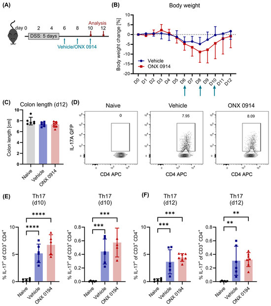 Second, we aimed to assess the effect of immunoproteasome inhibition on already differentiated Th17 cells. Therefore, colitis was induced first by DSS administration. ONX 0914 treatment started in a “therapeutic setup” after induction of the Th17 response on day 6 (Figure 2A), a time point at which the induction of newly differentiated Th17 cells can easily be observed (Figure 1E). As expected, mice started recovering weight after day 8 (Figure 2B). On day 12, vehicle- and ONX 0914-treated mice had recovered their original weight and colon length similarly (Figure 2A–C). These results indicate that immunoproteasome inhibition in a therapeutic setup has no positive effect on the recovery of DSS-induced colitis.
