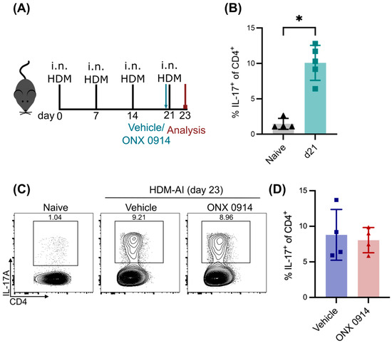 Th17 cells are not affected by immunoproteasome inhibition in house dust mite-induced airway inflammation (HDM-AI). (A) Experimental scheme. (B) GATIR mice received three intranasal applications of 50 µg HDM extract on days 0, 7 and 14. The Th17 response in the lung was analyzed on day 21 by flow cytometric analysis of the dissected and dissociated lung tissue. (C,D) GATIR mice received four intranasal applications of 50 µg HDM extract on day 0, 7, 14 and 21. One hour before the last immunization, mice were treated with 10 mg/kg ONX 0914 or vehicle subcutaneously. Inflammatory infiltration was analyzed by flow cytometry on day 23 by flow cytometric analysis of the dissected and dissociated lung tissue. Naïve mice served as controls. For all experiments, samples were restimulated in vitro for 5 h with PMA/ionomycin and treated with brefeldin A to analyze cytokine expression. (C) Representative plots showing the Th17 cell population in the lung after exclusion of doublets and dead cells and gating on CD4+. (D) Frequency of the Th17 cell population among all CD4+ T cells. Each point represents an individual mouse. Data from day 23 are representative for two independent experiments (n = 4). Results from day 21 show n = 5, derived from one experiment. Data are shown as mean ± SD. * p < 0.01 (Mann–Whitney test).
