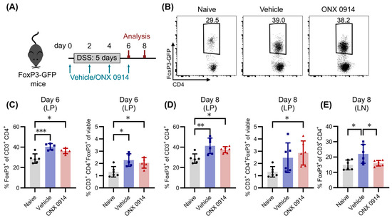 It was previously suggested that the reduction in Th17 cells upon immunoproteasome inhibition is accompanied, or even results from, an increase in Tregs, since a dysregulation of their balance is often found in autoimmune diseases [7]. Because they are important regulators in the modulation of immune responses to prevent excessive inflammation [33], they are also induced with a similar kinetic to Th17 cells in DSS-induced colitis. Accordingly, the frequency of Tregs in the lamina propria of DSS-treated mice was increased on day 6 compared to naïve mice (Figure 4B,C), and was slightly enhanced on day 8 (Figure 4D). In contrast to the effect on Th17 cells, there was no difference detectable between the two treatment groups, indicating that immunoproteasome inhibition does not affect the development of Tregs. In line with these results, the application of ONX 0914 after DSS treatment on day 6 and day 8 did not affect the frequency of Tregs on day 10 in the lamina propria (Supplementary Figure S5A). Since a previously published study by Kalim et al. investigated Tregs not in the lamina propria but in mesenteric lymph nodes [7], we also analyzed the lymph nodes in our study. There was no difference from naïve mice on day 6 (Supplementary Figure S5B), but Tregs were induced in the vehicle group on day 8 (Figure 4E). Interestingly, whereas Tregs were induced in the vehicle treated group in some mice, ONX 0914 treatment prevented Tregs induction in the lymph nodes compared to the lamina propria. Moreover, we analyzed Tregs in HDM-AI, as described in the previous section. Immunoproteasome inhibition did not affect Treg frequencies either in the lung or in the spleen (Supplementary Figure S6). Taken together, Tregs do not require functional immunoproteasome for their development, and enhanced Treg differentiation in our in vivo setups could not be detected.