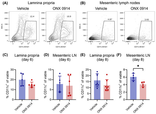 Dendritic cells (DCs) play a major role in the induction of Th17 cells in the intestine [34], and were reported to be affected by immunoproteasome inhibition [22,35,36,37,38]. Hence, an altered DC population in immunoproteasome inhibitor-treated mice might contribute to the reduced induction of Th17 cells in DSS-induced colitis (Figure 1). Therefore, the frequency of CD11c+ cells was analyzed in the lamina propria of the colon and in mesenteric lymph nodes. CD11c+ cells were slightly reduced in the lamina propria of ONX 0914-treated mice on day 6 and day 8, even though the data display high variation and the differences are not statistically significant (Figure 5A,C,E). Mesenteric lymph nodes are the major site for DC/T cell interaction [39], and accordingly, a robust population of CD11c+ cells could be detected there (Figure 5B). The variance on day 6 was very high, making a definite conclusion difficult, but interestingly, the CD11c+ population was markedly reduced on day 8 (Figure 5F), thus suggesting that DCs might be affected by immunoproteasome inhibition. Taken together, CD11c+ population in the lamina propria and in mesenteric lymph nodes was only slightly reduced in mice with DSS-induced colitis, and, in our opinion, is not the driving factor for the observed reduced induction in Th17 cells.