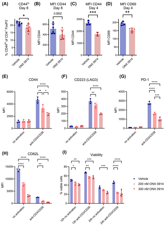 Impaired T cell activation by immunoproteasome inhibition. (A–D) Here, 2% DSS was added to the drinking water of (A,B) FoxP3-GFP and (C,D) IL-17A-GFP mice for 4–5 days followed by normal drinking water. Simultaneously, mice received subcutaneous injections of vehicle or ONX 0914 (10 mg/kg) every other day. (A,B) Mice were sacrificed on day 8 and CD44 expression was analyzed on non-Treg T cells identified as CD4+ FoxP3- cells in the spleen after exclusion of dead cells and doublets. (A) Frequency of the CD44hi population among CD4+ FoxP3- and (B) mean fluorescence intensity (MFI) of CD44 on CD4+ FoxP3- (pooled data from two independent experiments, n = 6). (C,D) Mice were sacrificed on day 4 and the expression of activation markers (C) CD44 and (D) CD69 was analyzed in the spleen on CD4+ T cells (n = 3–4). (E–I) CD4+ T cells were magnetically isolated from spleens of naïve mice and activated in vitro with plate-bound anti-CD3/CD28 antibodies. Samples were simultaneously treated with different concentrations of ONX 0914 or vehicle (DMSO) as control. (E–H) Expressions of different surface activation markers were analyzed after 24 h by flow cytometry (n = 3, representative of independent experiments yielding similar results). (I) Viability was analyzed after 12 and 24 h by flow cytometry (n = 3, representative of independent experiments yielding similar results). Data are shown as mean ± SD, and each point per group represents an individual mouse. * p < 0.05, ** p < 0.01, *** p < 0.001, **** p < 0.0001 (unpaired, two-tailed student’s t test or 2-way ANOVA).