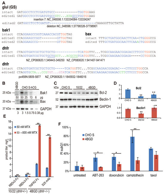 - Orlova, N.A.; Dayanova, L.K.; Gayamova, E.A.; Sinegubova, M.V.; Kovnir, S.V.; Vorobiev, I.I. Targeted Knockout of the dhfr, glul, bak1, and bax Genes by the Multiplex Genome Editing in CHO Cells. Dokl. Biochem. Biophys. 2022, 502, 40–44. [Google Scholar] [CrossRef] [PubMed]