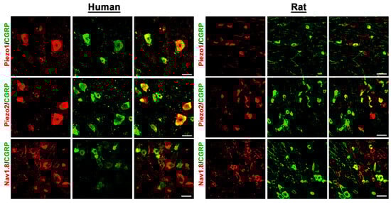 Double immunofluorescence confocal microscopy identified the existence of the TRP-ion channel members TRPV1, TRPV4, and TRPA1, the mechanosensitive ion channels PIEZO1 and PIEZO2, as well as the TTX-resistant voltage-gated Nav1.8 ion channel, in human DRG neurons (Figure 1 and Figure 2). Moreover, our results showed that TRPV1, TRPV4, and TRPA1, as well as PIEZO1, PIEZO2, and Nav1.8 immunoreactivity, colocalized with the peripheral sensory neuron marker CGRP in a subpopulation of human DRG neurons (Figure 1 and Figure 2). Intriguingly, these same pain-signaling molecules could be localized in the CGRP-immunoreactive (IR) subpopulation of rat DRG neurons (Figure 1 and Figure 2).