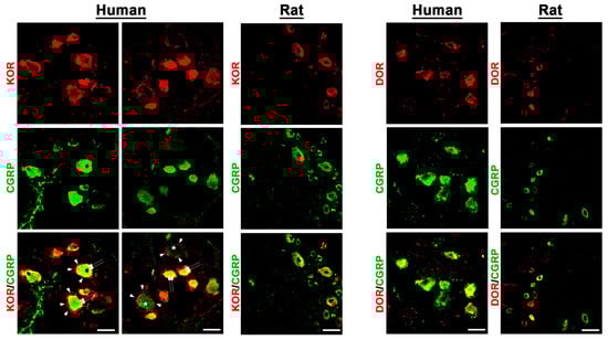 Using known specific antibodies [1,25] for the human MOR, DOR, and KOR, we could identify all three major opioid receptors in human DRG neurons, which were predominantly detectable in the subpopulation of CGRP-IR sensory neurons (Figure 3 and Figure 4).