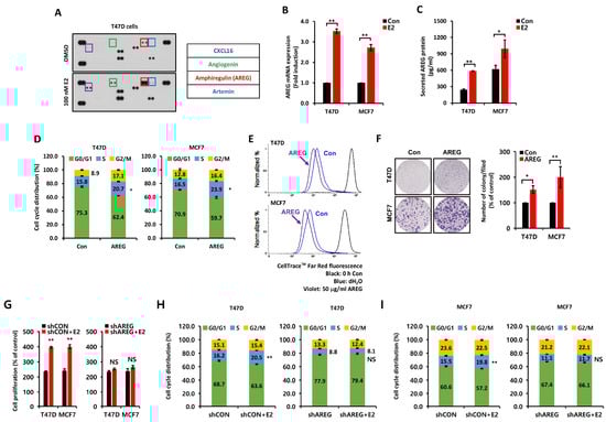 E2-induced AREG expression stimulates cell proliferation. (A) Secreted protein expression was analyzed using the proteome Profiler™ Human Angiogenesis Array Kit. T47D cells were treated with or without 100 nM E2 for 48 h. Conditioned culture media were harvested for secreted protein analysis. (B,C) The levels of AREG mRNA and protein were analyzed by real-time PCR (B) or ELISA (C). Each cell type was treated with or without 100 nM E2 for 24 h. (D) Cell cycles in T47D and MCF7 cells treated with or without 50 ng/mL AREG for 24 h were analyzed by flow cytometry. (E) Cell proliferation changes induced by AREG treatment were analyzed using CellTraceTM Far Red fluorescence. (F) Cell growth was analyzed using colony-forming assays. Each cell type was seeded in a six-well plate for 24 h and then treated with 50 ng/mL AREG for 14 days. (G) shCON or shAREG-transfected cells were incubated with or without E2 for 3 days, and cell proliferation was measured using the MTT assay. (H,I) T47D and MCF7 cells transfected with shCON or shAREG were incubated with or without E2 for 24 h, followed by cell cycle analysis using flow cytometry. All experiments were performed in triplicate. All p-values were calculated using unpaired two-tailed Student’s t-tests. NS: non significant * p < 0.05, ** p < 0.01.