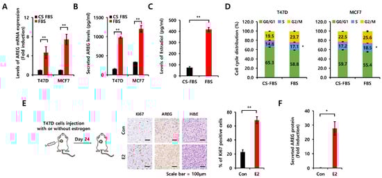 Because charcoal-stripped fetal bovine serum (CS-FBS) is commonly utilized in research on hormone-sensitive cancers to establish hormone-depleted cell culture environments [20], we compared the effects of CS-FBS and normal FBS on AREG expression. Each cell type was seeded into six-well plates for 24 h, washed with phosphate-buffered saline (PBS), and then incubated with CS-FBS-containing media or FBS-containing media for 24 h. As shown in Figure 3A, the level of AREG mRNA expression was significantly increased in FBS-containing media. Secreted AREG protein expression was also increased under the same conditions (Figure 3B). Therefore, we checked the levels of estradiol in each medium using an ELISA kit. The level of estradiol was increased by 5.6 ± 2.0-fold in FBS-containing media compared to CS-FBS-containing media (Figure 3C). Next, we investigated cell cycle alterations under the same conditions. Our results showed that CS-FBS-containing media induced cell cycle arrest at the G0/G1 phase in both T47D and MCF7 cells (Figure 3D). In contrast, the S phase and the G2/M phase ratio were increased by FBS-containing media (Figure 3D). Next, we examined the induction of AREG by E2 treatment using xenograft models (Figure 3E,F). Immunohistochemical (IHC) analysis showed the increased expression of the proliferation marker Ki67 and AREG in the xenograft model with E2 pellets compared to the absence of E2 pellets (Figure 3E). Blood AREG levels were also elevated in the xenograft model with E2 pellets (Figure 3F).