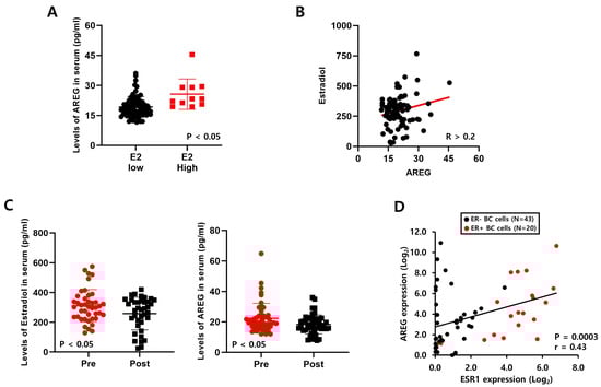We collected blood samples from ER+- breast cancer patients to verify the correlation between E2 and AREG (Table 1). We analyzed the levels of AREG and E2 expression in 100 blood samples using ELISA kits. As shown in Figure 4A, secreted AREG expression in serum was meaningfully increased in breast cancer patients with high E2. We also found that endogenous E2 expression was positively correlated with AREG expression (Figure 4B). Furthermore, we compared the expression of AREG and E2 according to pre- or post-menopausal status. The E2 levels in pre-menopausal patients were significantly higher than those in post-menopausal patients (Figure 4C). Consistent with this result, the levels of AREG expression were elevated in pre-menopausal patients with high E2 levels (Figure 4C).