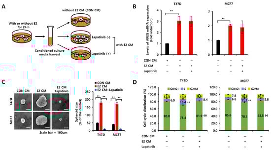 ER+ breast cancer cells were incubated with or without E2-containing media for 24 h to investigate the effect of E2-induced AREG on the EGFR signaling pathway. Twenty-four hours later, we harvested conditioned culture media (CM) and added new plates with ER+ breast cancer cells, with or without lapatinib, for 24 h. A schematic diagram of the experimental process is illustrated in Figure 5A. After sample collection, we analyzed the expression of AREG mRNA. As shown in Figure 5B, the level of AREG mRNA expression in both T47D and MCF7 breast cancer cells was increased by E2 CM treatment. Our results showed that E2 CM-induced AREG expression was not changed by lapatinib treatment (Figure 5B). However, under the same conditions, E2 CM-induced cell growth, including cell size and numbers, was completely blocked by lapatinib treatment (Figure 5C). Compared to CON CM treatment, cell cycle S-phase entry was triggered by E2 CM (Figure 5D). In contrast, S-phase entry by E2 CM was shifted to G0/G1 arrest by lapatinib (Figure 5D). In parallel, empty vector control or AREG knockdown cell lines were incubated with or without E2 for 24 h, and the CM were collected. Treatment with the four different CM showed that AREG knockdown diminished the effects of E2, resulting in no significant induction of S-phase entry or sphere growth (Figure S3). These results suggest that the induction of AREG by E2 mediates cell growth by activating the EGFR signaling pathway.