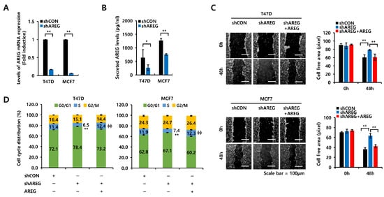 We silenced AREG expression in T47D and MCF7 cells using a lentiviral system to demonstrate its direct effect on the cell cycle or cell migration. The levels of AREG mRNA and protein expression were decreased by AREG knockdown (Figure 6A,B). Next, we analyzed cell migration. The cell-free area was decreased in ER+ breast cancer cells treated with vector only (Figure 6C). However, when AREG was knocked down, the cell-free area did not change significantly (Figure 6C). AREG knockdown decreased the migration distance of T47D and MCF7 breast cancer cells to 18.1 ± 3.8 pixels and 27.1 ± 2.5 pixels, respectively (Figure 6C). The increase in S-phase entry induced by AREG or E2 treatment was significantly suppressed upon AREG knockdown (Figure 6D). AREG knockdown decreased S-phase cell cycle entry to 4.9 ± 0.1% (in T47D cells) and 4.5 ± 0.6% (in MCF7 cells) (Figure 6D). The reduction in cell migration and the S-phase entry by AREG knockdown were rescued by treatment with recombinant AREG (Figure 6C,D). Thus, we suggest that AREG directly regulates cell proliferation and migration in ER+ breast cancer cells.