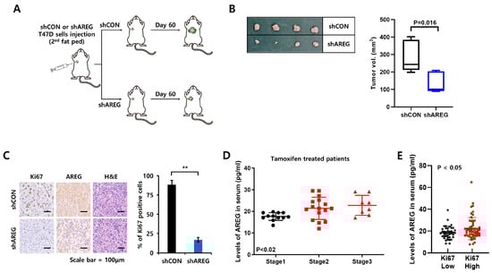 Lastly, we evaluated the effect of AREG knockdown on the tumorigenicity of T47D breast cancer cells using an orthotopic xenograft model. T47D cells with vector alone (shCON) or with AREG knockdown (shAREG) were injected into the second fat pad. After 60 days, we harvested tumor tissues. A schematic diagram of the experimental process is illustrated in Figure 7A. As expected, tumor volume was significantly decreased in the shAREG group (Figure 7B). IHC staining was used to analyze the levels of Ki67 (cell proliferation marker) and AREG. The expression of the proliferation marker Ki67 was decreased in AREG knockdown tumors (Figure 7C). We found that AREG expression in the serum of tamoxifen-treated ER+ breast cancer patients increased in a stage-dependent manner, although there were no stage 4 breast cancer patients in our sample (Figure 7D). Also, similar to the results in Figure 7C, AREG expression was increased in ER+ breast cancer patients with high Ki67 levels compared to those with low Ki76 levels (Figure 7E). Thus, the in vitro or in vivo data suggest that AREG plays an important role in the tumorigenicity of ER+ breast cancer.