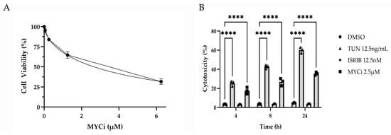 Antiproliferative and cytotoxic effects of MYC inhibition in vitro. An MTT assay performed to assess the dose response of HMGEC proliferation to MYCi361 (MYCi; n = 3 wells/concentration) over two days (A). Percent cytotoxicity calculated from lactate dehydrogenase (LDH) release measured from HMGEC supernatant following treatment with tunicamycin (TUN), integrated stress response inhibitor (ISRIB), or MYCi (n = 3 wells/treatment/time point) relative to the positive LDH control. Percent cytotoxicity of ISR- and MYC-modulated cells was compared to the experimental DMSO control at 4, 8, and 24 h (B). **** p ≤ 0.0001.
