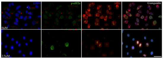 To determine whether MYC inhibition resulted in ISR modulation, immunolabeling for phospho-eIF2α (p-eIF2α) and MYC was performed on HMGECs following an eight-hour incubation with Myci361 or the vehicle control (DMSO). Suppressed MYC expression was confirmed, and cytoplasmic p-eIF2α expression was upregulated in MYC-inhibited cells relative to the vehicle control (Figure 2), indicating that MYC inhibition activates the ISR.
