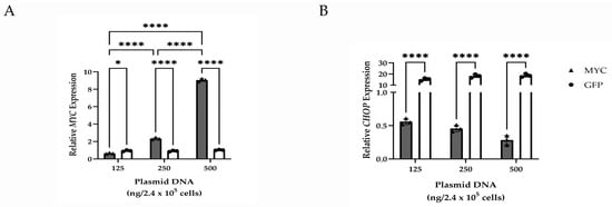 To evaluate the effects of MYC overexpression on CHOP expression, qPCR was performed on HMGECs following a five-day transfection with a plasmid encoding the MYC gene. Transfection efficiency in response to variable concentrations of plasmid DNA indicated a significant (p ≤ 0.0001) dose-dependent increase in MYC expression. MYC-overexpressing HMGECs also exhibited significant downregulation (p ≤ 0.0001) of CHOP relative to GFP-transfected cells (Figure 4). Collectively, these data demonstrate an inverse relationship between MYC and CHOP expression.