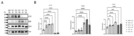 Western blotting was used to evaluate protein expression of components of the ISR including two of the implicated kinases in MYC-overexpressing tumors (GCN2, PERK) and CHOP. Densitometry demonstrated that MYC inhibition resulted in ISR induction through GCN2 activation, with significant time-dependent upregulation of GCN2 (p ≤ 0.0001) and CHOP (6 h: p = 0.0022; 12 h: p = 0.0014; 24 h: p ≤ 0.0001) following MYC inhibition (Figure 5). While PERK expression was significantly upregulated (p ≤ 0.0001) at the latest assessed time point of MYC inhibition (24 h), expression tended to be lower at earlier time points. Tunicamycin-treated cells exhibited cytotoxicity beginning at 12 h, with extensive cell death observed by 24 h. Protein lysates isolated from the 24 h time point were excluded from subsequent immunoblotting. Tunicamycin treatment resulted in significant upregulation of PERK (p ≤ 0.0001) and CHOP at the 6 h (p = 0.0007) and 12 h (p ≤ 0.0001) time points, respectively.