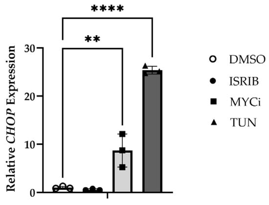 The effects of MYC inhibition and ISR modulation on CHOP expression were evaluated using qPCR. HMGECs incubated with both tunicamycin (p ≤ 0.0001) and MYCi361 (p = 0.0018) exhibited significantly upregulated CHOP expression relative to the DMSO control and ISR-inhibition (Figure 6), confirming the relationship demonstrated at the protein level.