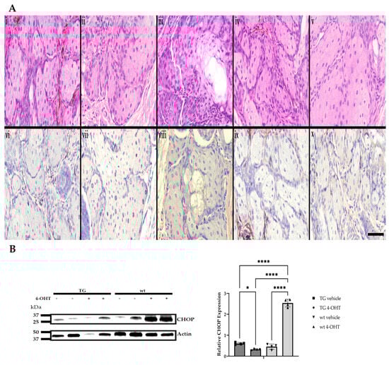 Morphologic features and CHOP expression in response to induced MYC expression in vivo. Representative photomicrographs of H&E-stained and CHOP-immunolabeled (DAB; brown) FFPE sections of murine Meibomian glands following a five-day induction with 4-hydroxytamoxifen (4-OHT) or vehicle control (n = 6 mice/group). Naïve wt (i,vi), vehicle-treated wt (ii,vii), 4-OHT-induced wt (iii,viii), vehicle-treated TG (iv,ix), and 4-OHT-induced TG eyelids (v,x). Scale bar: 25 µm (A). Relative protein expression of CHOP was increased in 4-OHT-treated wt mice when compared to all other groups (n = 4 mice/group). * p < 0.05, **** p ≤ 0.0001 (B).