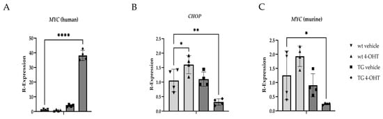Significant differences in MYC expression were confirmed between wt and K14MycER TG mice treated with the vehicle and 4-OHT (Figure 8A), respectively. Transcriptional expression of CHOP was significantly reduced (p = 0.0082) in 4-OHT-induced K14MycER eyelids and significantly increased (p = 0.0461) in 4-OHT-treated wt tissue relative to vehicle-treated wt animals (Figure 8B), further establishing the inverse relationship between MYC and CHOP. To assess for potential effects of induction of the human c-MYC cDNA on native MYC expression, qPCR using the murine-specific probe was also performed, revealing a significant decrease (p = 0.0408) in MYC expression in 4-OHT-treated TG mice relative to vehicle-treated wt littermates (Figure 8C).