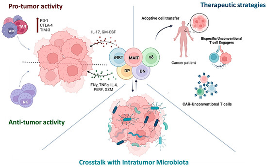 Unconventional T cells can play both pro- and anti-tumoral roles, influenced by the environment, especially the microbial one. Microbiome impacts UC T cells by modulating their development, phenotypes, and immune responses, which can influence cancer progression and immune evasion. The plasticity of these cells makes them promising therapeutic targets or agents, and in fact they are being explored through various strategies, including adoptive transfer, in situ activation, chimeric antigen receptor (CAR)-T cell engineering, and enhancement of their tumor-specific killing activity by bispecific T cell engagers administration. All this information is summarized in Figure 1.