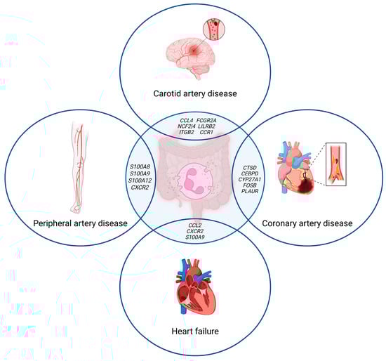 Thus, Z. Yao et al. identified common hub genes for CD and atherosclerotic disease of the lower extremities []. Among the 54 identified common differentially expressed genes, most were mainly related to pathways associated with neutrophil chemotaxis, neutrophil migration, and granulocyte chemotaxis. Based on the results from selecting hub genes among 15 potential candidate genes, four hub genes were selected that were significantly upregulated in both CD and peripheral arterial disease: S100A8, S100A9, S100A12, and CXCR2. The pathways associated with neutrophil activation, chemotaxis, and migration were significantly correlated with the high expression of S100A8, S100A9, S100A12, and CXCR2 in CD and peripheral arterial disease. In the work by X. Tang et al., the hub genes for IBD and coronary heart disease were CTSD (Cathepsin D), CEBPD (CCAAT–Enhancer-Binding Protein Delta), and CYP27A1 (Sterol 27-hydroxylase) []. Correlation analysis between the genes and immune cells showed that these genes directly correlated with the neutrophil count and negatively correlated with CD4+ T cells. In the study by X. Luo et al., the hub genes for IBD and heart failure were CCL2, CXCR2, and S100A9 []. According to the correlation analysis, CCL2, CXCR2, and S100A9 were directly correlated with neutrophils, including activated neutrophils. Thus, the present results again indicate the critical role of pathways associated with neutrophil activation, migration, and chemotaxis, in the development and progression of atherosclerosis in patients with IBD.