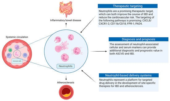 Atherosclerosis in patients with chronic inflammatory diseases, including IBD, is the result of complex interactions among specific patterns involving immune response dysregulation, inflammation, and traditional cardiovascular risk factors []. The extrapolation of approaches for assessing and monitoring cardiovascular risk used in the general population to patients in this category is associated with a systematic underestimation of the relevant risks and the late initiation of preventive measures []. Progress in studying the role of neutrophils in the development of atherosclerosis and other cardiovascular complications in patients with IBD will contribute to the introduction of new biomarkers into clinical practice that provide the possibility of personalized assessment and monitoring of cardiovascular risk, the discovery of new therapeutic targets, and the planning of cross-disease, cross-discipline basket trials [].