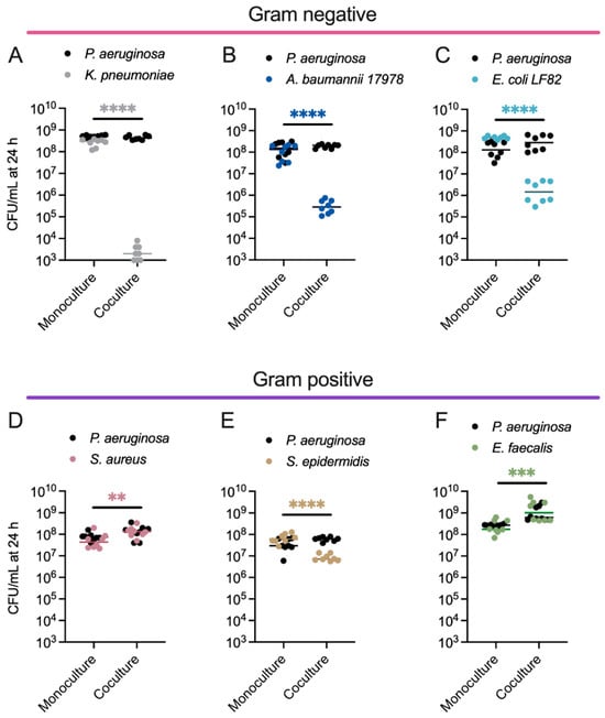 Dual species competitions between P. aeruginosa and other pathogens that co-infect human tissues reveal that PA inhibits the growth of Gram-negative ESKAPEE pathogens. Enumeration of PA and (A) KP, (B) AB, (C) EC, (D) SA, (E) SE, or (F) EF colony-forming units (CFUs) following 24 h growth in monoculture or co-culture. PA CFU for each replicate is indicated with black circles, and the competing bacterium CFU for each replicate is indicated with different colored circles, n = 8 biological replicates. The middle line indicates the median log-transformed CFU/mL per bacterium in monoculture or co-culture. Significant differences between the mono- vs. co-cultures were assessed by two-way ANOVA on the log10-transformed CFU/mL data, followed by Šídák’s multiple comparisons test. ** p < 0.01, *** p < 0.001, **** p < 0.0001. Complete statistical analysis is presented in Table S2.
