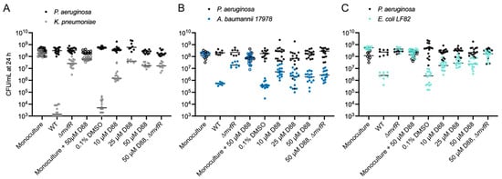 To begin addressing this gap, we measured the in vitro composition of a two-member community consisting of PA after 24 h in the presence of increasing concentrations of D88, the MvfR inhibitor. This revealed that disrupting MvfR activity with micromolar concentrations of the D88, but not its vehicle (DMSO), significantly alters the structure of the two-member community (Figure 3A–C, Table S3), without directly inhibiting the growth of any of these strains, even at a concentration exceeding those used in the competition experiments (Figures S3 and S4). The competition between KP, AB, or EC against PA ΔmvfR led to a significant rescue of survival in the secondary pathogens. The large shifts in the distribution of the two pathogens confirmed that the antagonism of PA towards these Gram-negative pathogens involves MvfR, and suggests that MvfR-regulated genes confer a conserved role in bacterial competition with diverse Gram-negative bacteria.