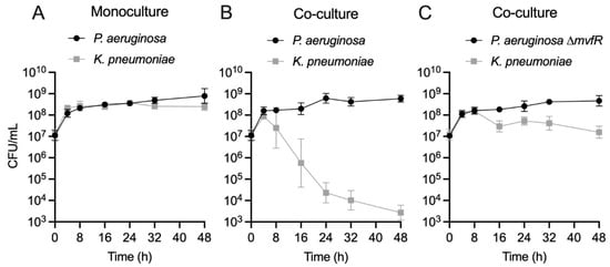 The quorum-sensing regulator MvfR is essential for direct antagonism of KP by PA in co-culture. (A) Enumeration of PA (black circle) and KP (gray square) CFU/mL over 48 h monoculture growth. Data point indicates the mean log-transformed CFU/mL, error bars indicate the 95% confidence interval. n = 8 biological replicates per time point. (B) Enumeration of PA (black circle) and KP (gray square) CFU/mL over 48 h co-culture growth. Data point indicates the mean log-transformed CFU/mL, error bars indicate the 95% confidence interval. n = 8 biological replicates per time point. (C) Enumeration of PA ∆mvfR (black circle) and KP (gray square) CFU/mL over 48 h co-culture growth. Data point indicates the mean log-transformed CFU/mL, error bars indicate the 95% confidence interval. n = 8 biological replicates per time point. Inoculating CFU at 0 h was 0.5–1 × 107 CFU/mL.