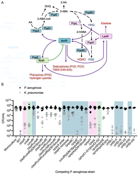 The major quorum-sensing systems in PA each contribute to inhibitory interactions with KP in co-culture. (A) Current view of the QS regulatory network in PA and a subset of its virulence-regulated functions (red text). MvfR, in the presence of PQS or HHQ, binds and activates the transcription of genes, including lasR and rhlR, and the pqsABCD operon and pqsE, whose encoded proteins catalyze the biosynthesis of compounds, including PQS, HHQ, HQNO, and 2-AA. Purple line indicates activation, and green line indicates inhibition, black dashed line indicates biosynthetic process. (B) Enumeration of KP CFU (gray) and PA CFU (black) following 24 h mono- or co-culture with different strains of PA. PA WT inhibits KP proliferation in EMEM (n = 16 independent replicates), compared to monoculture (n = 16 independent replicates). Deletion of each of the QS regulators (LasR, RhlR, or MvfR) in PA restores KP survival in co-culture, with deletion of mvfR (n = 16 independent replicates) having the strongest effect. Double and triple mutations in any combination of the QS regulators (n = 12 independent replicates) similarly restore KP survival. MvfR complementation (n = 8 independent replicates) of the triple QS mutant and the double LasR/RhlR mutant restores PA antagonism to the level of lasR and rhlR single mutants (n = 12 independent replicates). PA CFU were not significantly altered relative to monoculture in any competition. Colored shaded boxes indicate the primary QS regulator associated with the gene that was mutated: pink for LasR-regulated genes, green for RhlR-regulated genes, and blue for MvfR-regulated genes. The middle line indicates the median log-transformed CFU/mL of KP or PA in monoculture or co-culture. Significant differences between the mono- vs. co-cultures were assessed by two-way ANOVA on the log10-transformed CFU/mL data, followed by Dunnett’s multiple comparisons test. Complete statistical analysis is presented in Table S4. Note: CFU measurements from Figure 2A for the monoculture, WT, and ∆mvfR columns are included for comparison as they were completed as part of the same set of experiments.