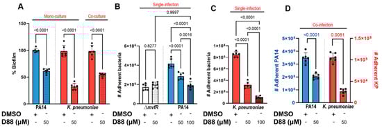 PA, KP, and SA are frequent colonizers of human lungs, causing major health implications. Since an anti-virulence approach does not affect viability, next, we assessed whether D88 treatment attenuates virulence in KP by measuring the biofilm formation and cell adherence of PA and KP in both single- and co-infection settings with or without exposure to D88. First, 50 µM of D88 reduced approximately 40% of biofilm formation in PA following 15 h of monoculture (Figure 6A). Strikingly, the biofilm formation in KP was also severely impaired by 50 µM of D88, leading to a reduction as high as 73%. Further, biofilm formation was also decreased during the co-culture with PA, revealing the anti-virulent efficacy of D88 against dual-species communities (Figure 6A). While crystal violet staining quantifies total biomass, it does not distinguish species or separate the bacterial load from matrix production. Therefore, we cannot determine whether these reductions stem from one or both species, or from decreased attachment versus matrix disruption. Future experiments will address these distinctions.