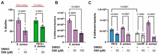 The MvfR inhibitor D88 significantly diminishes the virulence capacity of the Gram-positive pathogen S. aureus. (A) The % biofilm production in SA strain USA300 is significantly impaired upon treatment with 50 µM of D88 during mono- and co-culture. Total of 5 × 106 CFUs were inoculated for 15 h stationary incubation at 37 °C, and the biomass of biofilm was quantified by crystal violet staining. (B) D88 has an inhibitory effect in cell adherence to A549 cells during SA single-infection. (C) Treatment with 50 µM of D88 leads to decreased adherence to A549 cells during co-infection with 1:1 ratio of PA14 and SA. A549 cells at 100% confluency were infected at multiplicity of infection (MOI) of 25:1, and cells were incubated 1.5 h for adherence. The adherent bacteria were differentially enumerated after serial dilution. p-values of one-way ANOVA Tukey’s multiple comparisons test are shown numerically to indicate statistical significance. Complete statistical analysis is presented in Table S5.