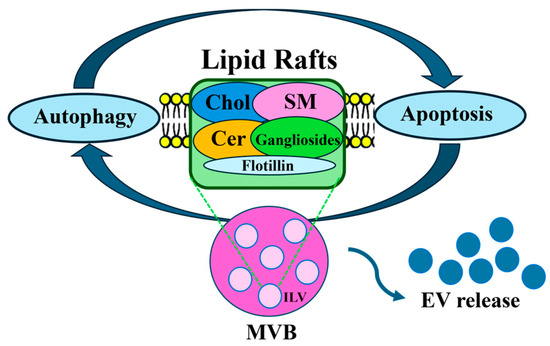 However, it could also be of interest to evaluate EV biogenesis and release during the interplay between apoptosis and secretory autophagy, with particular attention paid to the role of lipid raft components in regulating these pathways.