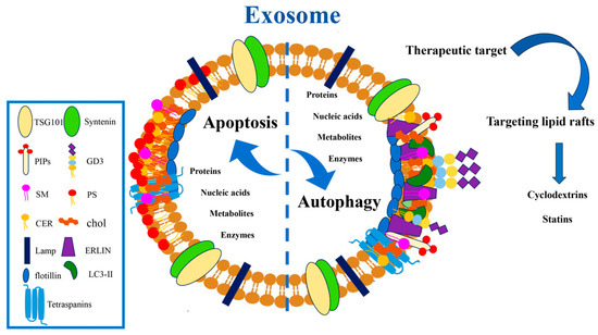 A schematic representation of an exosome enriched with classical exosome markers and lipid raft components involved in the crosstalk between apoptosis and autophagy. Lipid rafts may represent a target for drugs, such as cyclodextrins and statins. Abbreviations: Phosphoinositides (PIPs), Disialoganglioside (GD3), sphingomyelin (SM), Phosphatidylserine (PS), ceramide (CER), cholesterol (chol), lysosomal membrane protein (LAMP), ER lipid raft protein (ERLIN), microtubule-associated protein 1B-light chain 3 (LC3-II), Tumor Susceptibility 101 (TSG101).