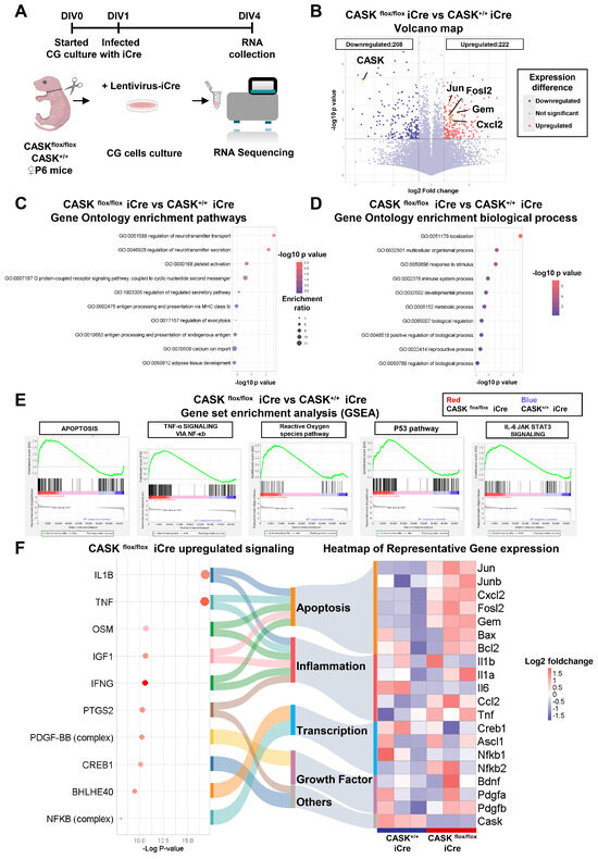 RNA-seq analysis showed activation of JNK signaling and apoptosis pathway in CASKflox/flox iCre CG cells. (A). Experimental design of the RNA-seq analysis. P6 CASKflox/flox and CASK+/+ mice were used for CG cell culture. Cells were infected with iCre in DIV1, RNA was collected in DIV4, and Protein was collected in DIV5. (n = 3 in each group). (B). Volcano map of gene expression difference between CASKflox/flox iCre CG cells and CASK+/+ iCre CG cells. Red indicated genes upregulated in CASKflox/flox iCre CG cells, blue indicated genes downregulated in CASKflox/flox iCre CG cells. (Threshold: p < 0.05, Fold change over2). (C). The top 10 Gene Ontology enrichment pathways in CASKflox/flox iCre CG cells analyzed by Metascape. (D). The top 10 Gene Ontology enrichment processes in CASKflox/flox iCre CG cells analyzed by Metascape. (E). Representative Gene Set Enrichment Analysis (GESA) results of apoptosis-related pathways. (F). Upregulated signaling in CASKflox/flox iCre CG cells was analyzed using IPA analysis, and the heatmap of the related gene expression detected by RNA-seq.