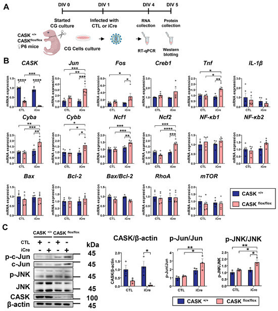 To confirm the RNA-seq results, we performed realtime-qPCR and Western blotting analysis in the extracts from CG cell cultures infected with lentivirus expressing iCre (Figure 2A). The expression of CASK in CASKflox/flox iCre was almost undetectable in these experiments indicating gene removal by Cre recombination was successful (Figure 2B). Of note, the expression level of CASK in CASKflox/flox control (CTL) cells was reduced to approximately 33% of that in CASK+/+ cells, as the insertion of loxP sites disrupts normal CASK expression in this hypomorphic allele [7]. Note that the expression of genes related to JNK signaling, such as c-Jun (p < 0.001) and c-Fos (p < 0.001), in CASKflox/flox iCre CG cells was significantly upregulated compared to the CASK+/+ iCre CG cells. The expression of ROS-related genes such as Cyba, Cybb, Ncf1, and Ncf2 was also significantly upregulated in CASKflox/flox iCre-infected CG cells. On the other hand, gene expressions such as IL-1β, NF-κb1, NF-κb2, and Bax/Bcl-2 were not significantly changed between each group (Figure 2B). Therefore, we decided to focus on the protein phosphorylation changes in JNK signaling and ROS pathway.