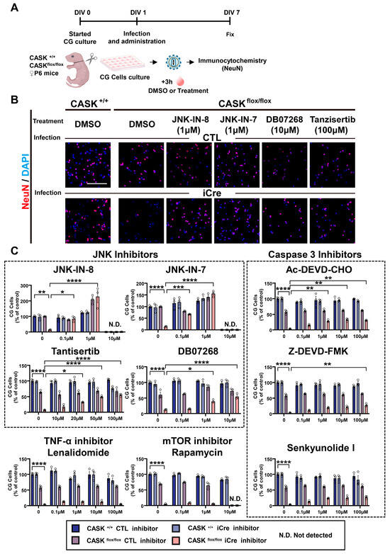 Administration of JNK inhibitors promoted the In Vitro survival rate in CG cells. (A). Experimental design of the intracellular signaling inhibitors administration on CG cells. CG cells were infected with lentivirus-iCre and lentivirus-CTL in DIV1, and 3 h later, the inhibitors were administered. In DIV 7, the CG cells were fixed and stained with NeuN and DAPI. (B). Images of CG cells stained with NeuN and DAPI, scale bar = 100 µm. (C). Changes in cell survival rate calculated by the NeuN and DAPI double-positive cells. The group of CASK+/+ CTL CG cells with DMSO was used as the control. (n = 3), * indicates difference between the groups. * indicates p < 0.05; ** indicates p < 0.01; *** indicates p < 0.001, and **** indicates p < 0.0001.