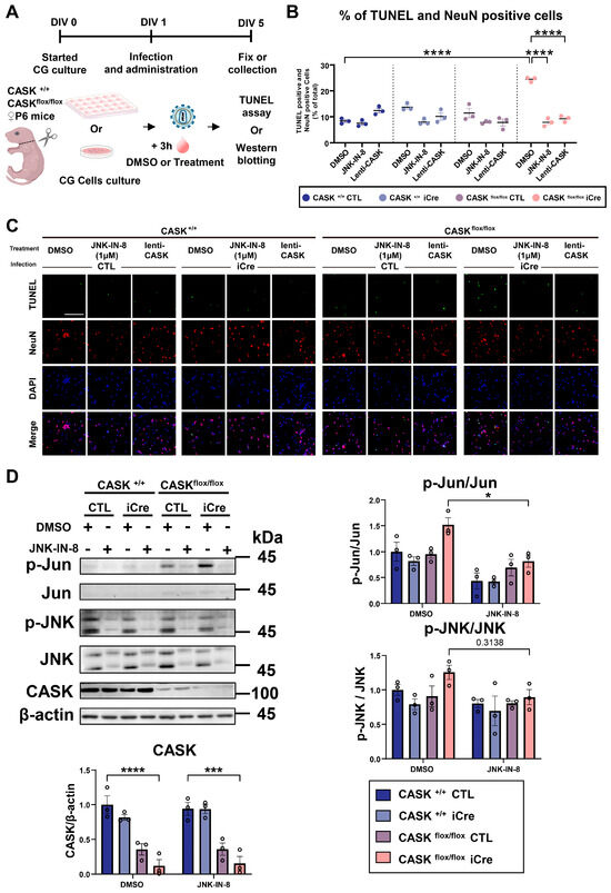 JNK inhibitor reduced apoptosis and JNK signaling in CASKflox/flox iCre CG cells. (A). Experimental design for TUNEL assay and Western blotting. CG cells were infected with lentivirus-iCre and lentivirus-CTL in DIV1, and 3 h later, the inhibitors were administered. In DIV5, the CG cells were fixed for TUNEL assay staining or collected for Western blotting. (B). Percentage of TUNEL and NeuN double-positive cells. (n = 3). (C). Images of CG cells with TUNEL, NeuN, and DAPI triple staining. Green: TUNEL; Red: NeuN; Blue: DAPI, scale bar =100 µm. (D). Western blotting analysis on CG cells with or without JNK-IN-8 administration. (n = 3 in each group) * indicates difference between the groups. * indicates p < 0.05; *** indicates p < 0.001 and **** indicates p < 0.0001.