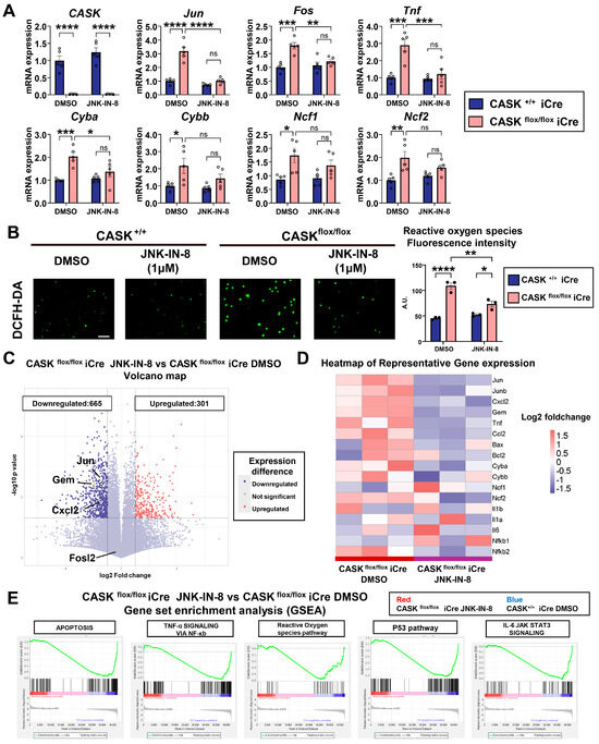 JNK inhibitor reduced apoptosis and the reactive oxygen species pathway. (A). Realtime-qPCR analysis on JNK-IN-8 or DMSO-treated CG cells. (n = 5 in each group). (B). Reactive oxygen species visualization and quantification of fluorescence intensity, scale bar =100 µm. (n = 3). (C). Volcano map of gene expression difference between JNK-IN-8 treated CASKflox/flox iCre CG cells and DMSO-treated CASKflox/flox iCre CG cells. Red indicated genes upregulated in JNK-IN-8 treated CG cells, blue indicated genes downregulated in JNK-IN-8 treated CG cells. Detected by RNA-seq. (Threshold: p < 0.05, Fold change over 2). (D). Heatmap of the representative gene expression detected by RNA-seq. (E). Representative Gene Set Enrichment Analysis (GESA) results of apoptosis-related pathways.* indicates difference between the groups. * indicates p < 0.05; ** indicates p < 0.01; *** indicates p < 0.001; and **** indicates p < 0.0001. ns indicates no significant difference.