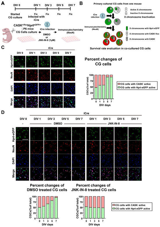Survival rate evaluation on heterozygous CASK knockout CG cells. (A). Experimental design on CASK+/floxHprteGFP/+ CG cells. (B). Schematic diagram showing how survival rate evaluation was conducted on different X chromosome-activated CG cells in co-cultivation. And the CG cells with double positive of eGFP and NeuN were viewed as the CG cells with Hprt-eGFP X chromosome active. The NeuN-positive CG cells without eGFP fluorescent light were viewed as the CG cells with CASK knockout (CASK-), X chromosome active. (C). Immunocytochemistry-stained Images of eGFP, NeuN, and DAPI in CG cells. The percent changes in CG cells were evaluated by those images. Green: Hprt-eGFP; Red: NeuN; Blue: DAPI. scale bar = 100 µm. (n = 3). (D). Immunocytochemistry stained Images of eGFP, NeuN, and DAPI in JNK-IN-8 or DMSO administrated CG cells. The percent changes in CG cells were evaluated. Green: Hprt-eGFP; Red: NeuN; Blue: DAPI. scale bar = 100 µm. (n = 3).