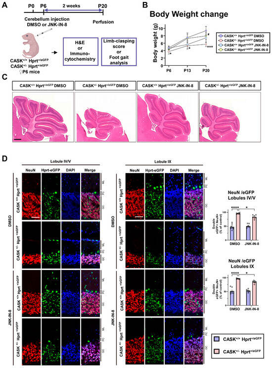 JNK-IN-8 administration In Vivo cerebellum development of CASK+/- HprteGFP/+ mice. (A). Experimental design on CASK+/- HprteGFP/+ and CASK+/- HprteGFP/+ mice. (B). Body Weight changes in CASK+/- HprteGFP/+ and CASK+/- HprteGFP/+ mice. (n = 5)(* indicates difference between CASK+/- Hprt+/eGFP DMSO and CASK+/+ Hprt+/eGFP DMSO, # indicates difference between CASK+/- Hprt+/eGFP JNK-IN-8 and CASK+/- Hprt+/eGFP DMSO). (C). Photography of H&E stained cerebellum slices, scale bar = 500 µm. (D). Immunohistochemistry stained Lobules IV/V slices and Lobules IX. ML, molecular layer; PC, Purkinje cell layer; GC, granular cell layer. The ratio of double-positive cells of NeuN and eGFP was calculated. (n = 7) * indicates difference between the groups. *, # indicate p < 0.05; *** indicates p < 0.001; and **** indicates p < 0.0001.