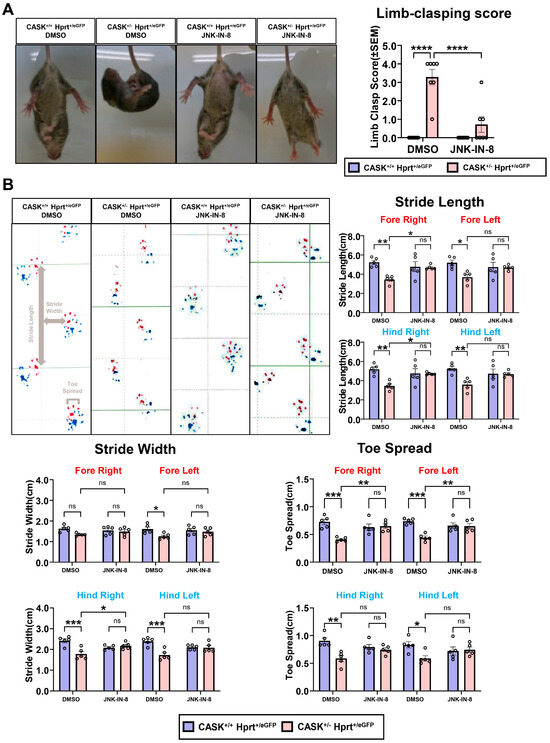 Behavioral analyses indicated that JNK-IN-8’s administration improved cerebellum function. (A). Photography on P20 CASK+/+ HprteGFP/+ and CASK+/- HprteGFP/+ mice, treated with or without JNK-IN-8. Limb-clasping scores were calculated by their behavioral performance. (n = 7). (B). Gait analysis record and the stride length, stride width, and toe spread were measured separately from each limb. Red ink: Forelimbs; Blue ink: Hindlimbs. (n = 5) * indicates difference between the groups. * indicates p < 0.05; ** indicates p < 0.01; *** indicates p < 0.001; and **** indicates p < 0.0001. ns indicates no significant difference.