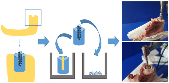 In order to assess the effect of negative pressure on bone tissue growth and on osteoblast proliferation and differentiation, organ cultures of bone cylinders, as well as osteoblast cell cultures, were established using bone from pigs’ mandibular condylar processes (6–8 months old; see Figure 1). Mandibles were retrieved from a local slaughterhouse within 24 h of slaughtering. After removing the perichondrium, identical bone cylinders (diameter 5 mm, depth 10 mm) were cut out of the heads of the mandibular condylar processes samples (see Figure 1) using a steel trepan drill bit (Ø 5 mm; Helmut Zepf Medizintechnik GmbH, Seitingen-Oberflacht, Germany; see Figure 1). To create an identical bone defect (diameter 2.8 mm, depth 5 mm) in each cylinder, a central borehole was drilled with an implant drill bit (Straumann AG, Basel, Switzerland). The bony borehole grindings were collected (see Figure 1), quantified, and cultivated.