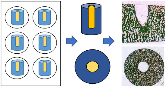 The bone cylinders were briefly washed in culture medium and then placed into 6-well plates (see Figure 1) containing Dulbecco’s modified Eagle’s medium (DMEM) supplemented with 10% fetal calf serum (FCS) and 1% amphotericin/penicillin/streptomycin (all Gibco, Eggenstein, Germany) and cultured at 37 °C and 5% CO2 (see Figure 1). The culture medium was changed twice per week. Samples were incubated for up to 6 weeks and treated with negative pressure (530 mbar and 725 mbar) every 12 h for 30 min, compared to the control group (1013 mbar). Negative pressure was generated using a vacuum pumping unit (PC 3004 Vario, Vacuubrand GmbH Co., KG; Wertheim, Germany).