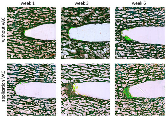 An increase in newly generated bone tissue (highlighted in light green; see Figure 3) was clearly observed over time. This effect was stronger with the application of VAC, with the highest amount of newly formed bone tissue detected after 6 weeks at 530 mbar (see Figure 3F).