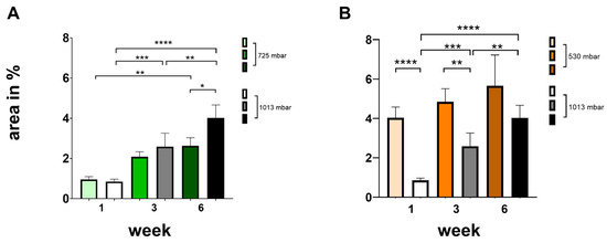 Influence of negative pressure (725 mbar: (A); 530 mbar: (B)) on bone formation [area in %] in comparison to atmospheric pressure (* p ≤ 0.05, ** p ≤ 0.01, *** p ≤ 0.001, **** p ≤ 0.0001, mean ± standard deviation, n = 10).