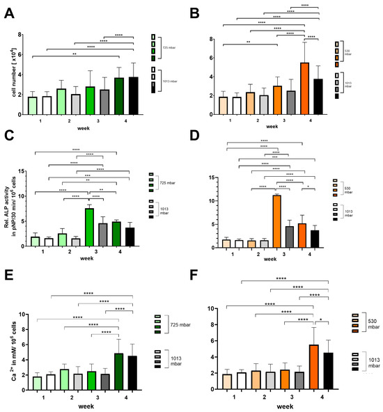 The ALP activity (pNP/30 min/106 cells) peaked at 3 weeks for both 725 mbar and 530 mbar and then declined by week 4. Compared to atmospheric pressure, ALP activity after 3 weeks was significantly increased by 165% at 725 mbar and by 245% at 530 mbar (see Figure 5C,D).