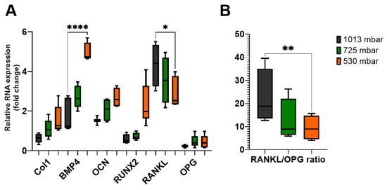 Gene expression levels of osteogenic markers (A) in osteoblasts treated with (725 mbar, orange bars; 530 mbar, green bars) or without VAC (1013 mbar, black bars) for 3 weeks. Reverse transcription quantitative PCR results of BMP4, Col1, OCN, RUNX2, RANKL, and OPG were normalized to GAPDH (n = 10). RANKL/OPG ratio (B) was calculated mathematically (* p ≤ 0.05, ** p ≤ 0.01, **** p ≤ 0.0001, mean ± standard deviation).